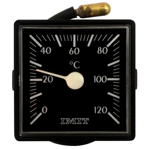 Термометр капиллярный предназначен для непрерывного измерения температуры жидкостей или газов, нейтральных к воздействию на металл. Термометр имеет цилиндрический корпус с черной квадратной рамкой, квадратный циферблат черного цвета с белыми надписями и белой стрелкой, медный капилляр с покрытием ПВХ.
