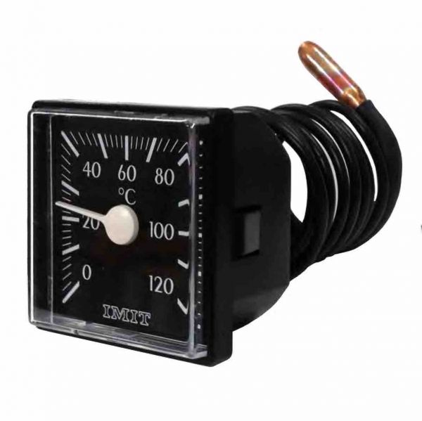 Термометр капиллярный предназначен для непрерывного измерения температуры жидкостей или газов, нейтральных к воздействию на металл. Термометр имеет квадратный корпус с черной квадратной рамкой, квадратный циферблат черного цвета с белыми надписями и белой стрелкой, медный капилляр с покрытием ПВХ.